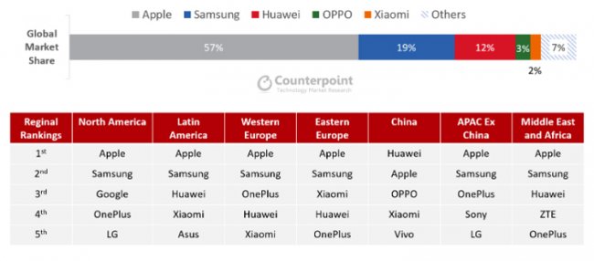В общем объёме выручки в сегменте премиальных смартфонов на долю Apple приходится 57 %, то есть, более половины отрасли. На втором месте находится Samsung с 19 %. «Бронза» досталась Huawei — 12 %.
