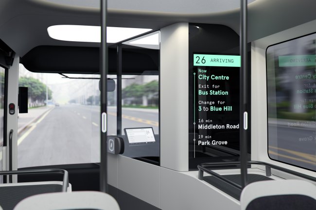 Автобус Arrival также имеет панель дисплея позади водителя, которая показывает дополнительную информацию о маршруте. А сенсорная панель, очень похожая на используемую в Tesla Model 3 и Model Y, расположена сбоку от водителя. Как и в Tesla, этот экран заменяет множество стандартных кнопок, которые обычно можно найти в передней части автобуса. Приёмники монет и карт заменены на сенсорные датчики.