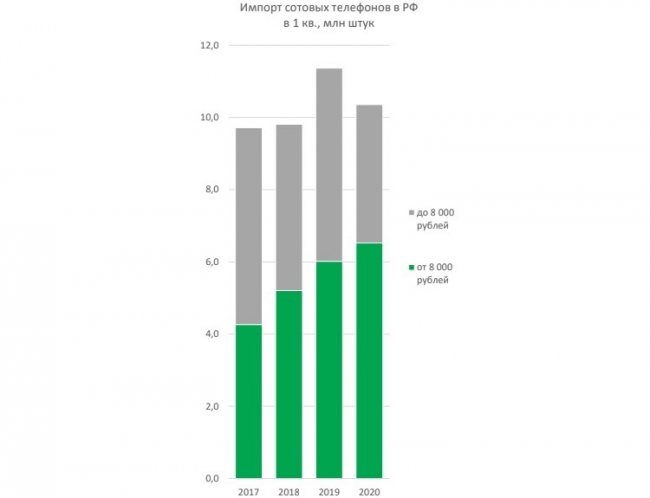 Всего за первые три месяца года в Россию импортировали 10,4 млн мобильных телефонов, из которых 6,5 млн единиц являлись смартфонами с розничной стоимостью от 8000 рублей. По сравнению с аналогичным временным отрезком прошлого года объём импортируемых смартфонов снизился на 9 %. Такое падение обусловлено снижением спроса на мобильные телефоны с ценой ниже 8000 рублей. По сравнению с первым кварталом прошлого года спрос на такие устройства снизился на 28 %.