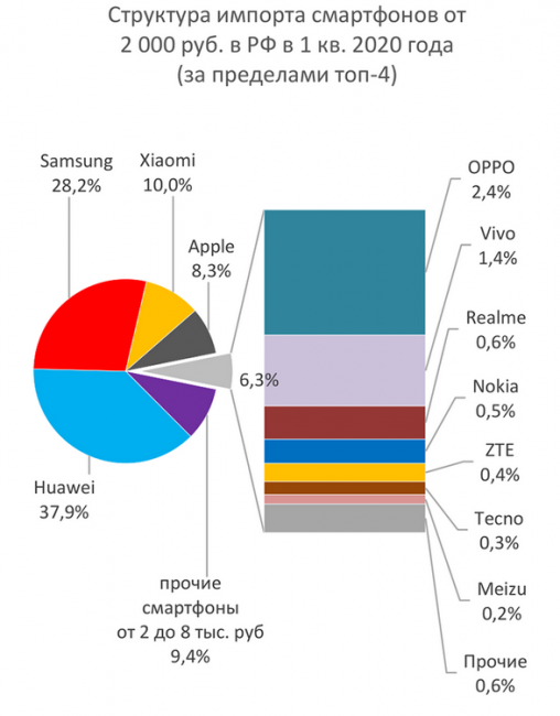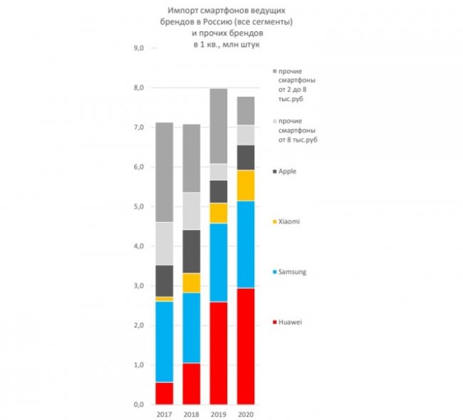 Бесспорным лидером российского рынка смартфонов продолжает оставаться компания Huawei (включая бренд Honor). Доля китайского производителя в первом квартале выросла на 13 % по сравнению с аналогичным периодом годом ранее и составила 38 % (2,95 млн смартфонов). Южнокорейская компания Samsung занимает вторую позицию с долей рынка в 28 % и 2,2 млн импортированных устройств. Замыкает тройку лидеров Xiaomi, поставки смартфонов которой выросли на 53 % по сравнению с результатом за первые три месяца 2019 года. В общей сложности китайская компания поставила в Россию 0,77 млн мобильных телефонов, что позволило ей занять 10 % рынка. Что касается Apple, то американская компания за первый квартал импортировала в Россию 640 тыс. смартфонов, что на 11 % больше по сравнению с показателем первого квартала прошлого года. Доля компании на рынке в отчётном периоде составила 8 %.