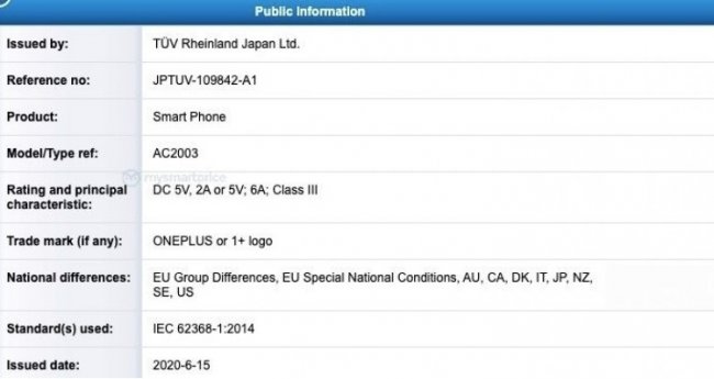 Готовящийся в выходу на рынок среднебюджетный смартфон OnePlus Z, также известный как OnePlus Nord, был сертифицирован TUV Reinland для использования 30-Вт быстрой зарядки. Устройство имеет модельный номер АС2003, и, как видно из списка, опубликованного на сайте, будет доступно в большинстве стран мира.