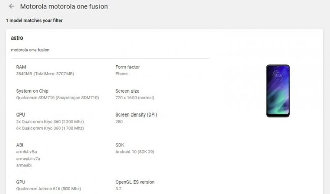 В базе данных Google Play Console появилась информация об относительно недорогом смартфоне Motorola One Fusion: сведения о подготовке этого аппарата ранее уже мелькали в Интернете.