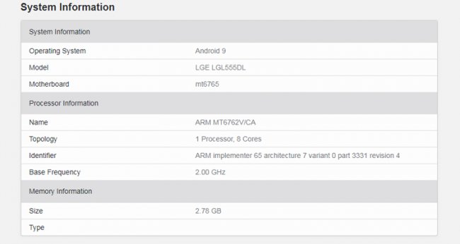 Южнокорейская компания LG, по информации сетевых источников, готовит к выпуску новый смартфон начального уровня. Сведения об аппарате обнаружены в базе популярного бенчмарка Geekbench. Информация сайта - «print-prime.ru» Устройство имеет кодовое обозначение LGL555DL. Пока не ясно, под каким именем оно дебютирует на коммерческом рынке, но тест даёт представление о возможностях модели. Известно, в частности, что основой новинке служит процессор MediaTek Helio P22. Чип содержит восемь вычислительных ядер ARM Cortex-A53 с тактовой частотой до 2,0 ГГц, графический ускоритель IMG PowerVR GE8320 и сотовый модем LTE. В составе смартфона LGL555DL процессор Helio P22 функционирует в тандеме с 3 Гбайт оперативной памяти. Известно также, что в качестве программной платформы применяется операционная система Android 9 Pie. Характеристики дисплея не раскрываются, но можно предположить, что его разрешение не превысит 720р. Параметры камер пока также держатся в секрете. Появление информации о новинке в базе Geekbench говорит о её скором официальном анонсе. Цена, вероятнее всего, не превысит 100–120 долларов США. и: