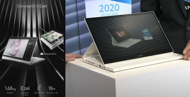 В категории «ножницы» главной новинкой стал ConceptD 3 Ezel — мощный гибридный ноутбук с закреплённым на необычном шарнире сенсорным дисплеем. Это позволяет использовать ноутбук в различных режимах, например, как планшет или «холст» для рисования. Комплектный стилус имеет 4096 уровней чувствительности. Ноутбук доступен в версиях с 14- и 15-дюймовыми дисплеями с заводской калибровкой до DeltaE<2.