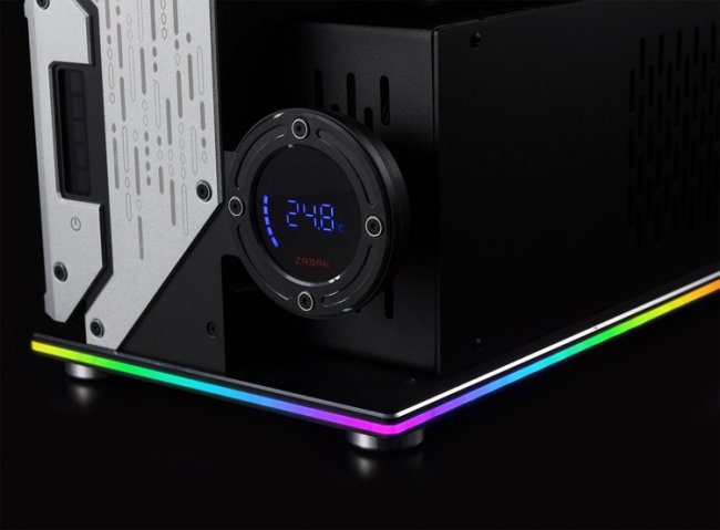 Компания Zadak анонсировала корпус MOAB II Elite, предназначенный для формирования игровой настольной станции, оборудованной системой жидкостного охлаждения (СЖО). Новинка, как утверждается, совместима с большинством материнских плат типоразмера Micro-ATX. Допускается применение дискретных графических ускорителей длиной до 280 мм. Корпус изначально оборудован компонентами СЖО. Это алюминиевый радиатор с габаритами 276 ? 120 ? 30 мм и водоблок с размерами 88 ? 88 ? 20 мм. Модель MOAB II Elite располагает эффектной многоцветной подсветкой ARGB. Специальный дисплей, выполненный в виде модуля круглой формы, позволяет в режиме реального времени отслеживать температуру охлаждающей жидкости. Общие габариты корпуса составляют 311 ? 193 ? 371 мм, вес — приблизительно 7,3 кг. Разработчик с гордостью заявляет, что MOAB II Elite — это первый в мире компьютерный корпус, наделённый ёмкостной сенсорной кнопкой включения/отключения питания. Информации об ориентировочной цене новинки на данный момент нет. :