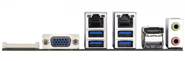 В оснащение входят двухпортовый сетевой контроллер GbE LAN и звуковой кодек Realtek ALC887. На панели с разъёмами располагаются интерфейсы D-Sub, HDMI 2.0 и DisplayPort для вывода изображения, четыре порта USB 3.0, два гнезда для сетевых кабелей и аудиогнёзда.