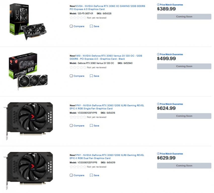 Ассортимент различных вариантов GeForce RTX 3060 появился в американских магазинах BestBuy и Newegg. У последнего цены начинаются с 330 долларов. Во столько оценены, например, модели Gigabyte GeForce RTX 3060 Eagle и EVGA GeForce RTX 3060 XC Black. В BestBuy цена самого доступного предложения — EVGA GeForce RTX 3060 XC — начинается с $390.