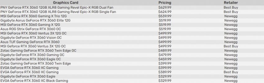 С полным списком цен на различные версии GeForce RTX 3060 в магазинах BestBuy и Newegg можно ознакомиться в таблице ниже: