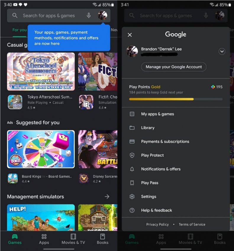 Когда пользователь впервые откроет новый интерфейс магазина Google Play и попробует открыть привычное меню с левой стороны, система выведет диалог, сообщающий, что все пункты меню Play Маркет были перемещены на миниатюру профиля. Например, возможность открыть «Книги» или «Фильмы и сериалы» была перемещена в раздел «Библиотека», в один ряд со списком желаний и семейной библиотекой. «Платежи и подписки» тоже были сведены в один пункт меню.