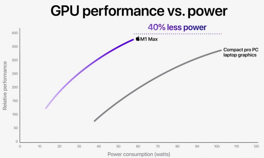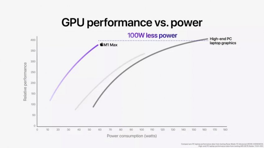 Отмечается и повышенная эффективность новых чипов. Например, Apple M1 Max потребляет на 100 Вт меньше неназванной высокопроизводительной дискретной видеокарты для ноутбуков. Но такая графика в основном встречается в массивных игровых системах. Если же сравнивать с компактными профессиональными ноутбуками, то разница в энергопотреблении при сравнимой производительности составляет 40 %.