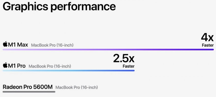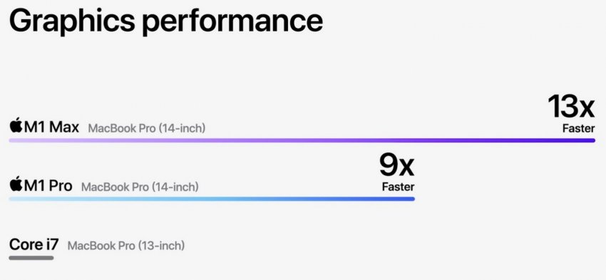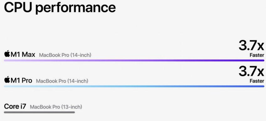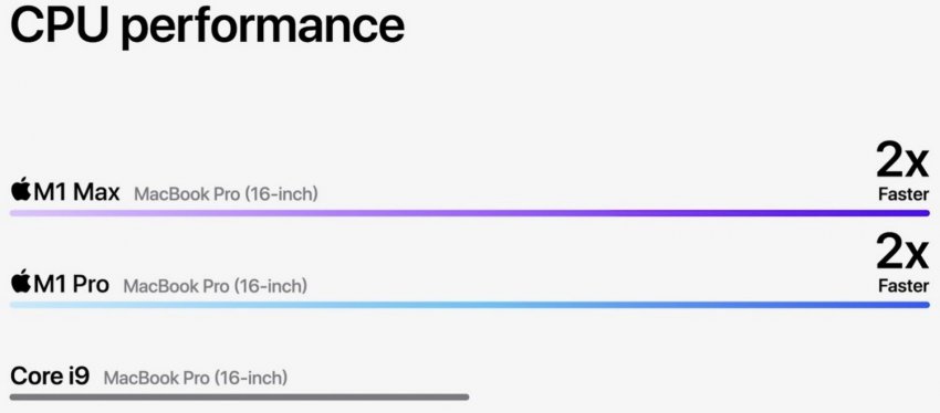 Если же сравнивать новые чипы Apple с решениями Intel в MacBook Pro прошлых поколений, то разница наблюдается многократная. Так, CPU новинок в 2 раза производительнее, чем Core i9 в старших прошлогодних 16-дюймовых MacBook Pro, а также в 3,7 раза производительнее Core i7 старших 13-дюймовых MacBook Pro.