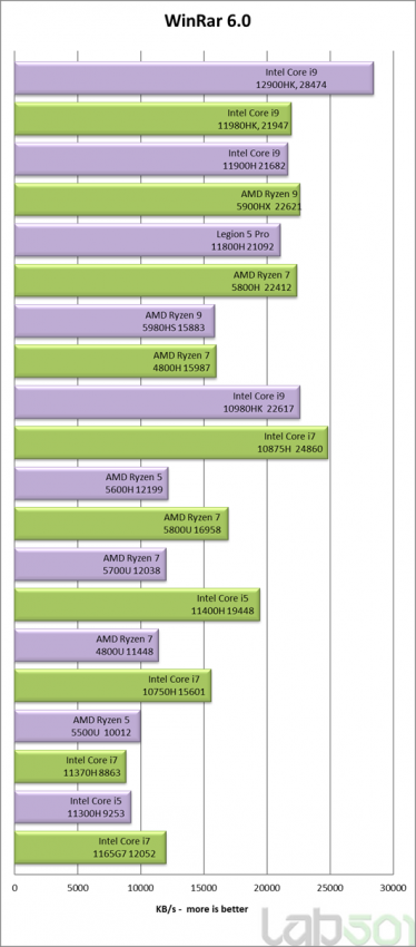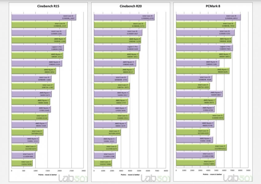 Хотя Intel в рамках презентации сама рассказала о производительности Core i9-12900HK и сравнила её с результатами конкурентов, в статье Lab501 приводятся результаты чипа в различных синтетических тестах, включая Cinebench, Blender, WinRAR и PCMark 8. По их итогам Core i9-12900HK оказался в среднем до 29 % быстрее, чем Ryzen 9 5900HX. Ресурс также указал, что новый процессор Intel оказался быстрее 16-ядерного Ryzen Threadripper 1950X. Однако следует учитывать, что этот 180-Вт HEDT-процессор AMD появился на рынке более 4 лет назад.