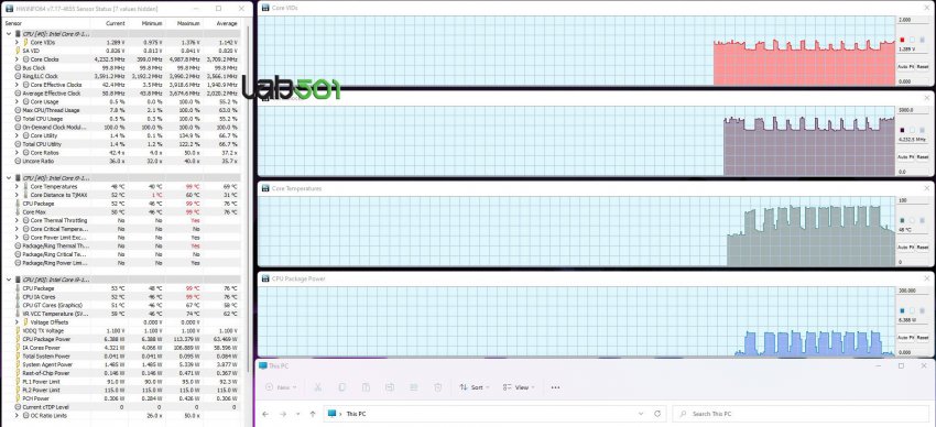 В сегменте ноутбуков рабочие температурные показатели и уровень энергопотребления могут значительно отличаться от одной модели лэптопа к другой. Поскольку Lab501 не указал, в составе какого ноутбука тестировался процессор Core i9-12900HK, можно смело предположить, что он использовался в ноутбуке с не самой эффективной системой охлаждения. При тестах пиковая температура процессора достигала 99 градусов по Цельсию. Средний же показатель температуры находился на уровне 69 градусов на одно ядро и до 76 градусов для всего чипа. Пиковый показатель энергопотребления составил 113 Вт, однако средний находится на уровне около 63 Вт.