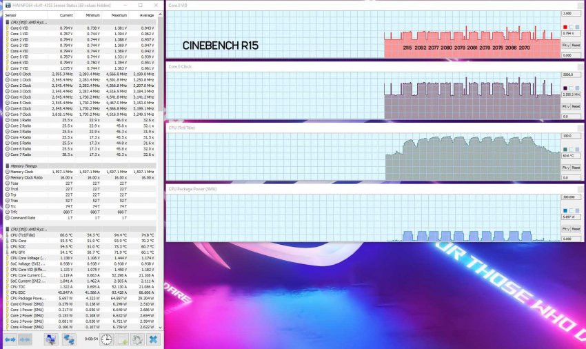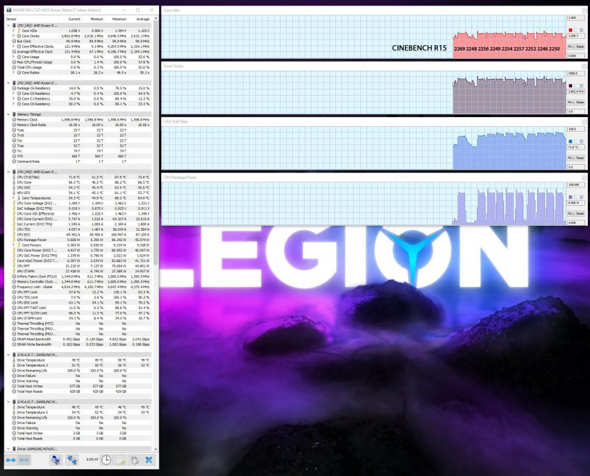 На сайте Lab501 также обнаружилась пара тестов процессора Ryzen 9 5900HX. Один использовался в составе ASUS ROG Strix Scar 17 (G733QS), у которого пиковая температура составила 94 градуса по Цельсию, а средняя — на уровне 70 градусов. У модели Lenovo Legion 7 (16ACHG6) на базе того же процессора пиковая температура чипа составила 88 градусов по Цельсию, а средняя — около 69 градусов. При этом пиковое энергопотребление процессора в системе ASUS равнялось 65 Вт, а среднее — 30 Вт.