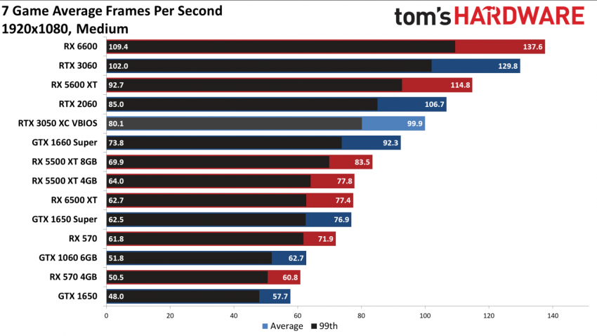 Тесты Computer Base показали в целом аналогичную картину: GeForce RTX 3050 является чем-то средним, между GeForce GTX 1660 Super и GeForce RTX 2060. И также она примерно вдвое быстрее вышедшей недавно Radeon RX 6500 XT. Тесты Computer Base 1080p высокое и максимальное качество