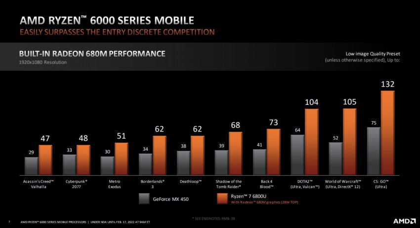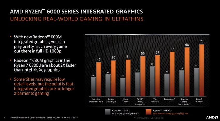 Компания заявляет, что встроенная графика новых процессоров обеспечивает более высокую производительность по сравнению со встроенной графикой Intel Iris (Xe-LP), даже в составе энергоэффективных моделей Ryzen 6000U, рассчитанных на использование в тонких и компактных ультрабуках. Согласно внутренним тестам AMD, «встройка» Intel Iris обеспечивает от 26 до 47 кадров в секунду в популярных играх. В свою очередь Radeon 680M с 12 вычислительными блоками в тех же играх выдаёт от 47 до 73 кадров в секунду.