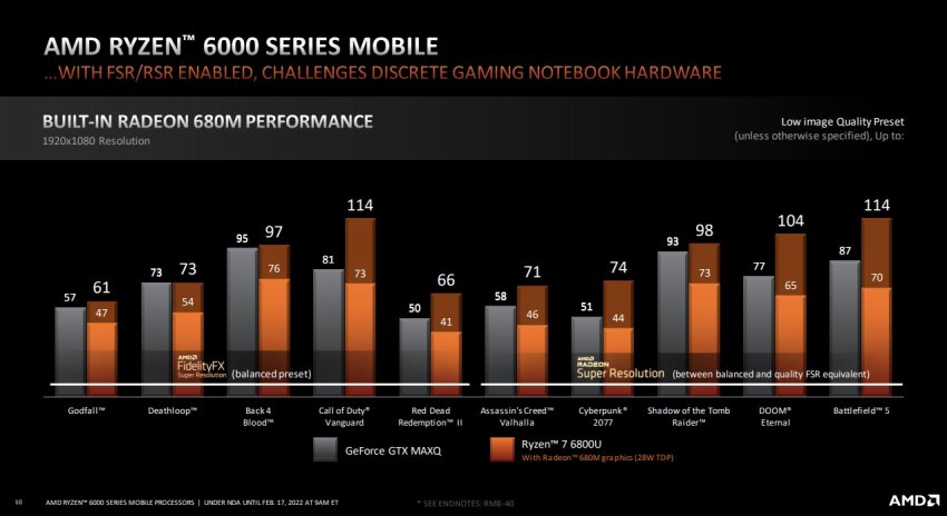AMD также сравнила новую встроенную графику процессоров Rembrandt с мобильными видеокартами GeForce MX 450 и GeForce GTX 1650 Max-Q. Последней решение AMD по уровню чистой производительности проигрывает, однако поддержка технологий масштабирования AMD FidelityFX Super Resolution (FSR) и Radeon Super Resolution (RSR) позволяет интегрированной графике «красных» вырываться вперёд.