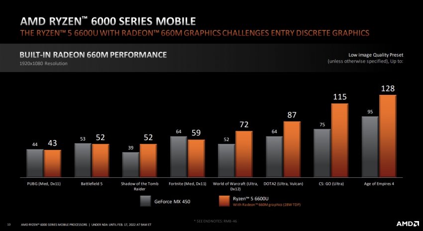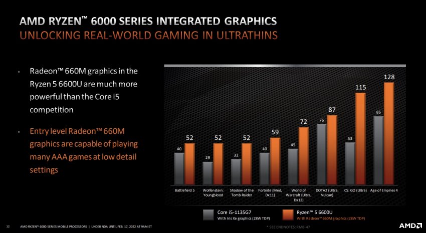 Производитель также уделил внимание младшей «встройке» Radeon 660M с шестью вычислительными блоками RDNA 2, работающими на частоте до 1,9 ГГц. Она используется в составе процессора Ryzen 5 6600U. Своё решение AMD сравнила со встроенной графикой процессора Intel Core i5-1135G7 (Tiger Lake-U). Оба чипа обладают одинаковым показателем TDP до 28 Вт.