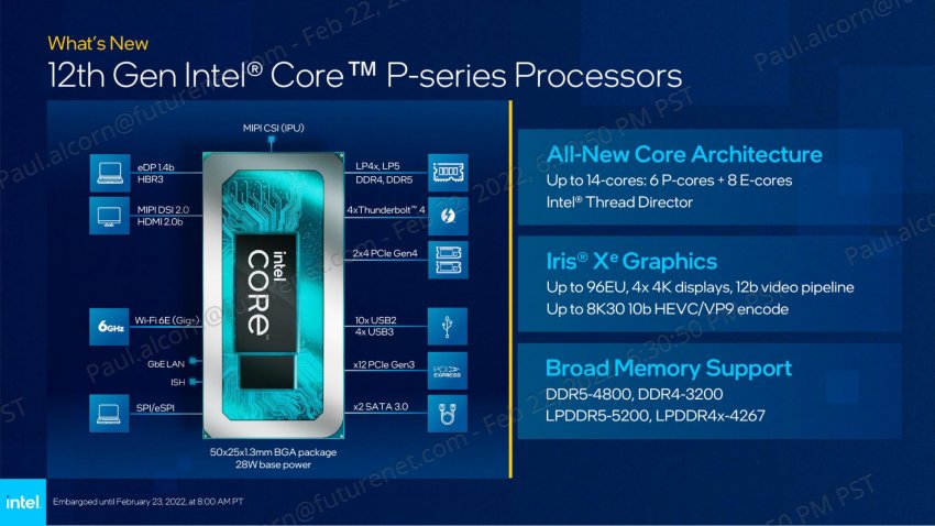 Старшие модели серии P, как и флагман H-серии, процессор Core i9-12900HK, смогут предложить до 14 ядер (6 производительных и 8 энергоэффективных) и 20 потоков, а также интегрированную графику Iris Xe. В свою очередь старшие модели U-серии получат два производительных и восемь энергоэффективных ядер.