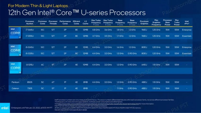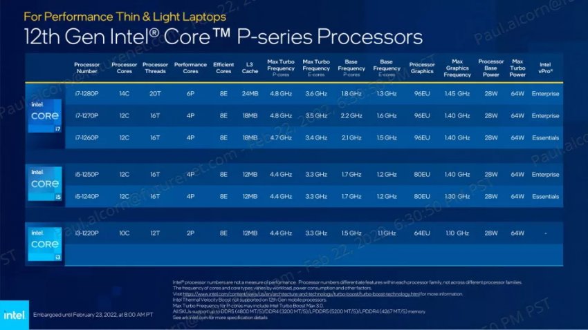 В отличие от вышедших в минувшем месяце высокопроизводительных мобильных Alder Lake H-серии с номинальным показателем TDP 45 Вт, обе вышеуказанные серии энергоэффективных чипов Core 12-го поколения предназначаются для использования в составе тонких и лёгких ноутбуков.