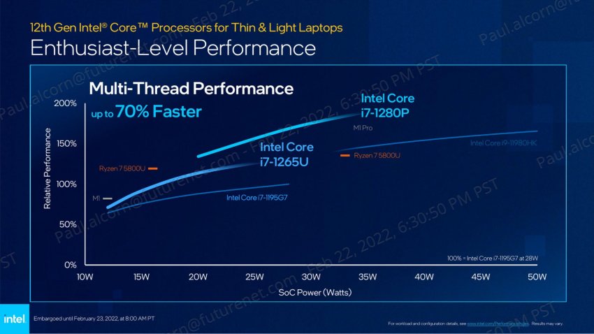 Компания поделилась некоторыми показателями производительности новых мобильных процессоров P- и U-серий согласно своим внутренним тестам. На первом графике теста Spec (на изображении ниже) отображена относительная производительность новых процессоров Intel с учётом показателя энергопотребления на фоне конкурентов. В сравнении принимали участие чип Apple M1, представитель предыдущей серии Intel Tiger Lake, а также модель Ryzen 7 5800U. Выбор последнего объясняется тем, что на момент тестов чипы AMD Ryzen 6000, представленные в прошлом месяце, не были доступны.