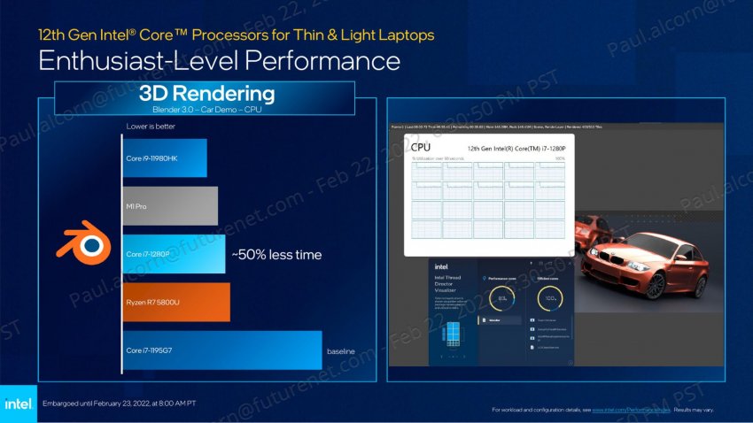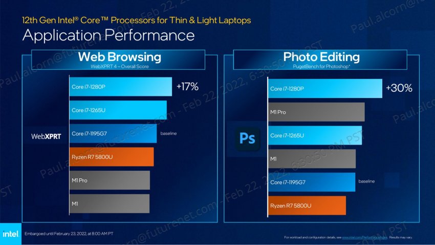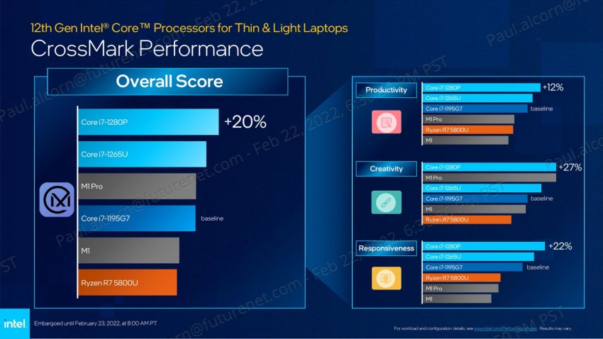 По словам Intel, многопоточная производительность процессоров Alder Lake P-серии до 70 % выше по сравнению c флагманом Core i7-1195G7 поколения Tiger Lake с номинальным TDP 28 Вт. В свою очередь модели Alder Lake U-серии до 30 % быстрее представителей предыдущего поколения. Следует отметить, что Intel заявляет о 70-процентном превосходстве чипов нового поколения над своими же процессорами предыдущего поколения, а не над решениями AMD и Apple. В проверке однопоточной и многопоточной производительности новых чипов также использовались приложения Blender, WebXPRT 4 (тест браузера), PugetBench для Photoshop и бенчмарк CrossMark, представляющий собой комплексный тест всей системы в тех или иных задачах.