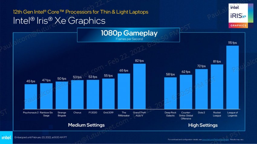 Поскольку в процессорах Alder Lake P- и U-серий используется тот же интегрированный графический процессор, что и в чипах Tiger Lake, то значительных изменений в производительности здесь ожидать не стоит. Тем не менее, компания предоставила данные о быстродействии встроенной графики новых чипов в некоторых играх при разрешении 1080p с использованием средних и высоких настроек изображения.
