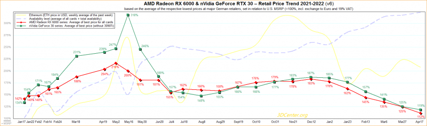 Если в начале 2022 года средняя цена на ускорители была на 80 % выше рекомендованной стоимости, то к 17 апреля она лишь на 12 % выше для моделей Radeon RX 6000 и на 19 % выше для GeForce RTX 30-й серии. 3DCenter обычно публикует отчёты каждые три недели. С момента последнего отчёта стоимость ускорителей в среднем снизилась на 13 процентных пунктов для видеокарт Radeon и на 6 процентных пункта для GeForce.