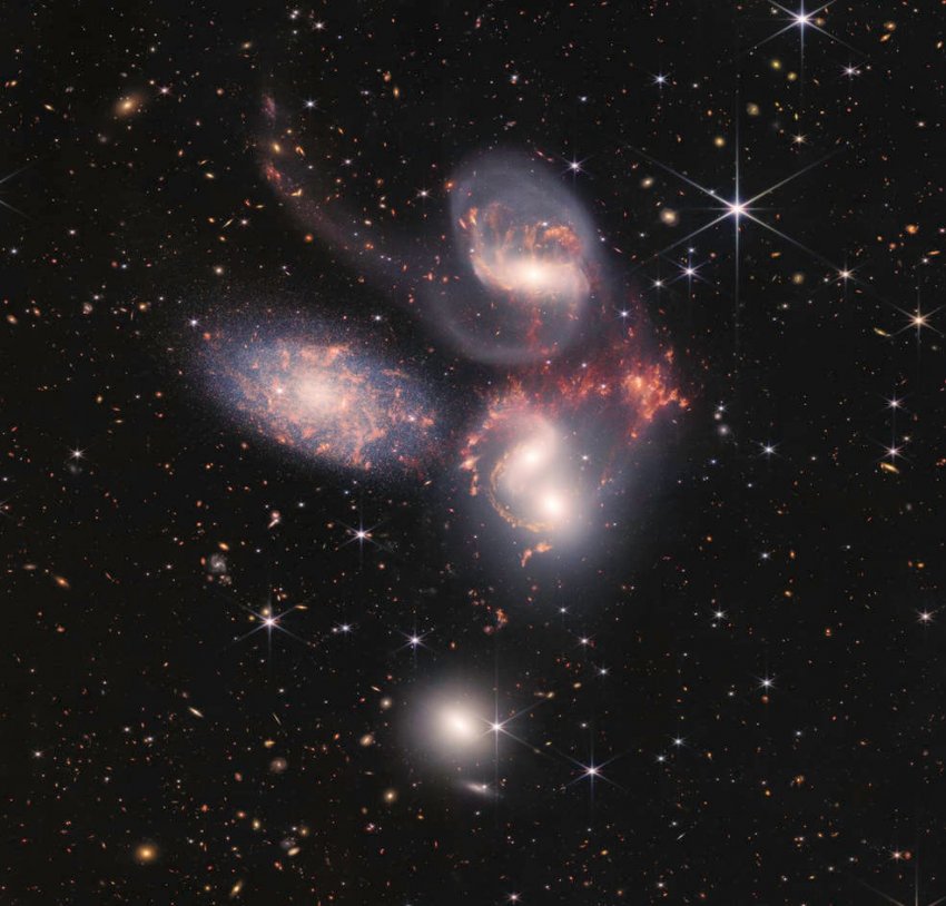 Квинтет Стефана является компактной группой галактик в созвездии Пегаса. Космический телескоп сумел прорваться сквозь пелену звёздной пыли, которая окружает центр одной из галактик группы, чтобы рассмотреть состав газа вблизи расположенной там сверхмассивной чёрной дыры. Эти данные помогут учёным оценить, как взаимодействующие галактики провоцируют звёздообразование друг в друге и как происходит возмущение газа в этих галактиках.