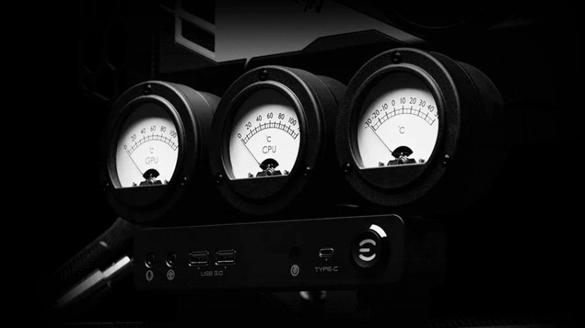 Выглядит новинка тоже впечатляюще в немалой степени благодаря подвесной конструкции лотка материнской платы. Картину довершают аналоговые датчики температуры GPU, центрального процессора и всей системы в целом. Этот блок совмещён с панелью разъёмов. В состав последней входят 3,5-мм аудиовыходы для наушников и микрофона, два USB 3.0 и разъём USB Type-C.