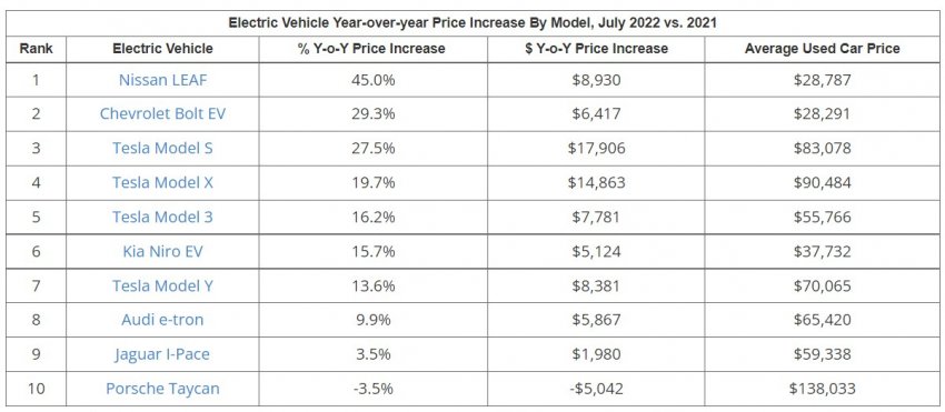 Интересно, что две электрические модели, цены на которые за год выросли больше всего, являются также самыми доступными электромобилями на рынке – это Nissan Leaf и Chevy Bolt EV. Подержанный Leaf сейчас продается в среднем за $28 787, что на 45 % больше, чем в прошлом году. При этом жизненный цикл Leaf подходит к концу, и компания Nissan рассматривает возможность снятия этой модели с производства в ближайшие годы. Между тем, цена Bolt, который с недавнего времени продается с большими скидками, составляет в среднем 28 291 доллар, что на 29,3 % больше, чем в 2021 году.