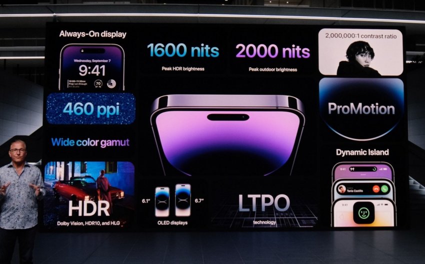 Смартфоны оснащены OLED-дисплеями Super Retina XDR с яркостью до 1600 кд/м2 при выводе картинки с HDR, а на улице пиковая яркость может и вовсе достигать 2000 кд/м2. Поддерживается переменная частота обновления от 1 до 120 Гц. В iPhone 14 Pro используется 6,1-дюймовая панель, тогда как iPhone 14 Pro Max получил 6,7-дюймовый экран. Появилась у iPhone и давно ожидаемая функция Always-On Display, которая давно есть у Android-смартфонов и позволяет выводить важную информацию на экран, даже когда смартфон заблокирован.