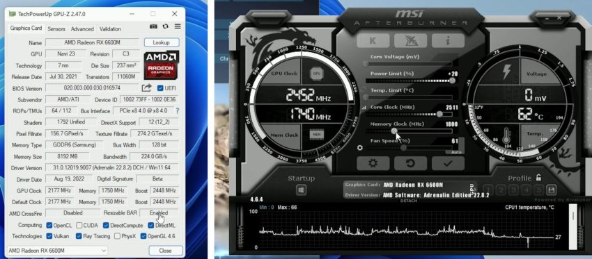 Техноблогер Miyconst раздобыл один из таких самодельных ускорителей и проверил его возможности. Как выяснилось, графический чип Radeon RX 6600M в составе настольной видеокарты можно разгонять до стабильных 2,5 ГГц. Однако разгон памяти не работает. При попытке изменить её частоту карта уходит в безопасный режим. При этом утилита GPU-Z карту определяет, как мобильную.