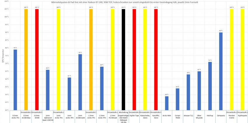 Для создания нагрузки использовался стресс-тест Furmark, который для каждого термоинтерфейса запускался на 5 минут. В случае с термопрокладками, лишь половина из протестированных образцов справилась с задачей — с остальными температура GPU достигла 105 °C, после чего запустился механизм троттлинга (снижение частот). Медный скотч тоже не справился с задачей, равно как и медная паста. Ожидаемо хорошо показали себя термопасты, и даже дешёвые решения не допустили троттлинга.