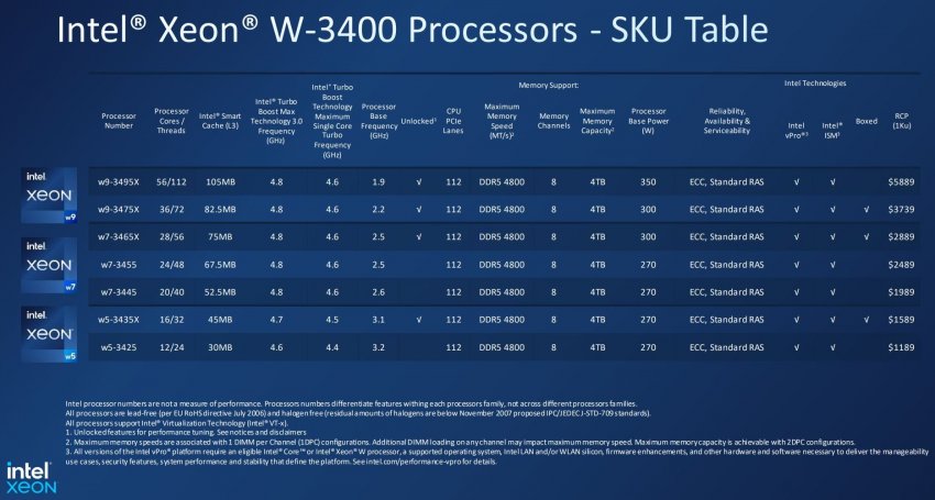 Представители старшего семейства Xeon W-3400 способны предложить от 12 до 56 ядер, на каждое из которых также приходится два потока. Здесь базовые частоты находятся в промежутке от 1,9 до 3,2 ГГц, а максимальные частоты также ограничены 4,8 ГГц. В этом семействе тоже представлены чипы с поддержкой разгона, включая упомянутый уже 56-ядерный флагман Xeon w9-3495X. Уровень TPD составляет от 270 до 350 Вт в зависимости от модели.