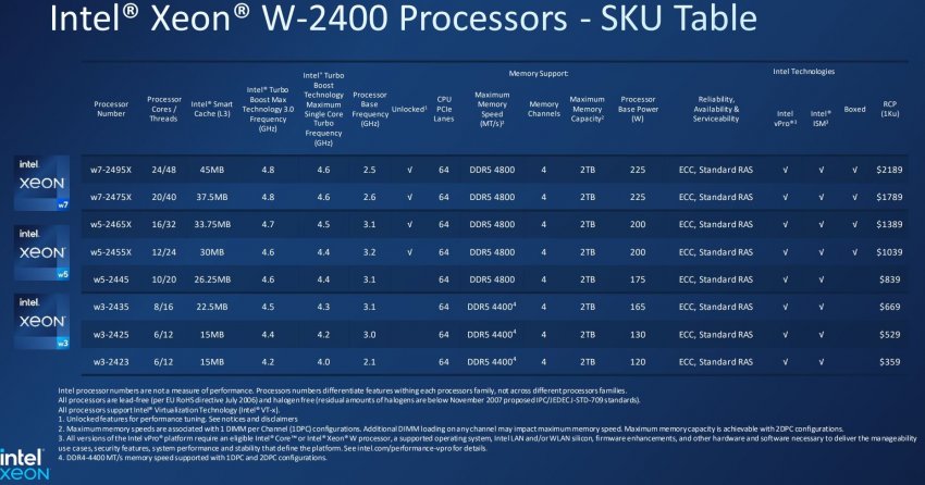 В младшем семействе Xeon W-2400 представлены процессоры с числом ядер от шести до 24. Используются ядра Golden Cove, которые поддерживают технологию Hyper-Threading, то есть процессоры предлагают вдвое большее число потоков, чем ядер. Базовые частоты варьируются от 2,1 до 3,2 ГГц, тогда как максимальные Turbo-частоты достигают 4,8 ГГц у старших моделей. При этом старшие чипы Xeon W-2400 также обладают разблокированным множителем, то есть их можно разгонять. Уровень TDP составляет от 120 до 225 Вт.
