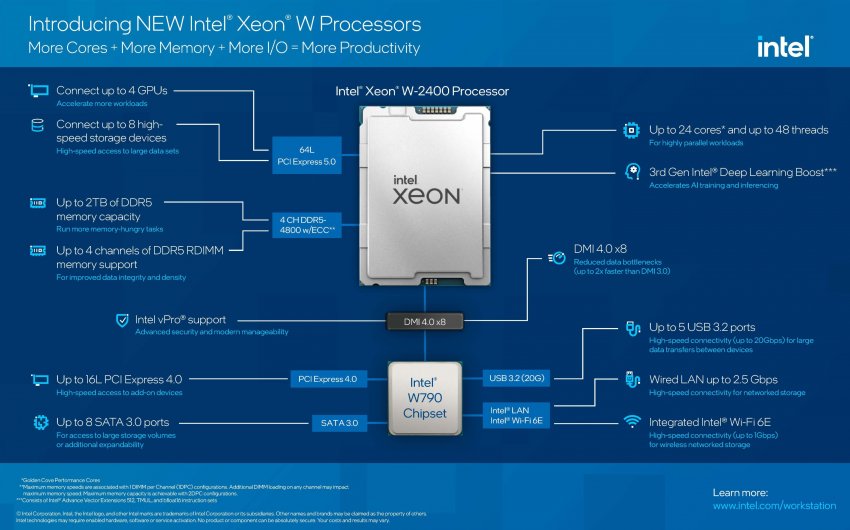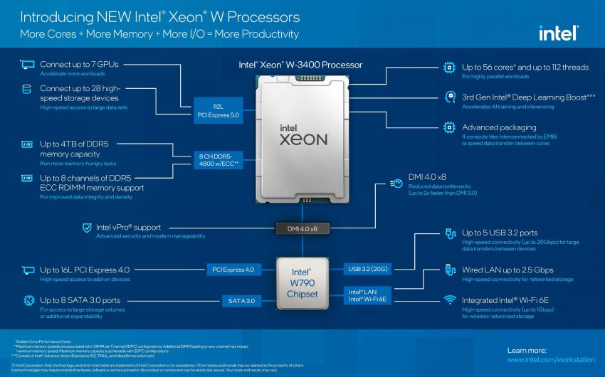 Процессоры Xeon W-3400 предлагают 112 линий PCIe 5.0, тогда как модели младшего семейства — 64 линии того же стандарта. Все новинки выполнены под процессорный разъём LGA 4677 и будут работать с чипсетом W790. Заявлена поддержка Wi-Fi 6E и проводного 2.5G Ethernet.