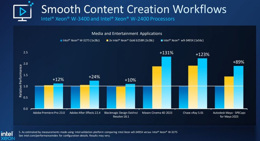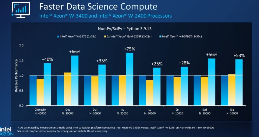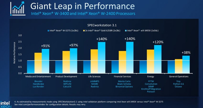 Что касается производительности, то сама Intel заявляет о повышении быстродействия на величину до 28 % в однопоточных задачах, и на величину до 120 % в многопоточных по сравнению с чипами предыдущего поколения, то есть моделями Intel Xeon W-3200 (Cascade Lake). При этом на слайдах можно заметить, что новый Xeon w9-3495X опережает Xeon W-3275 на величину до 140 %, хотя во многих задачах отрыв куда более скромный.