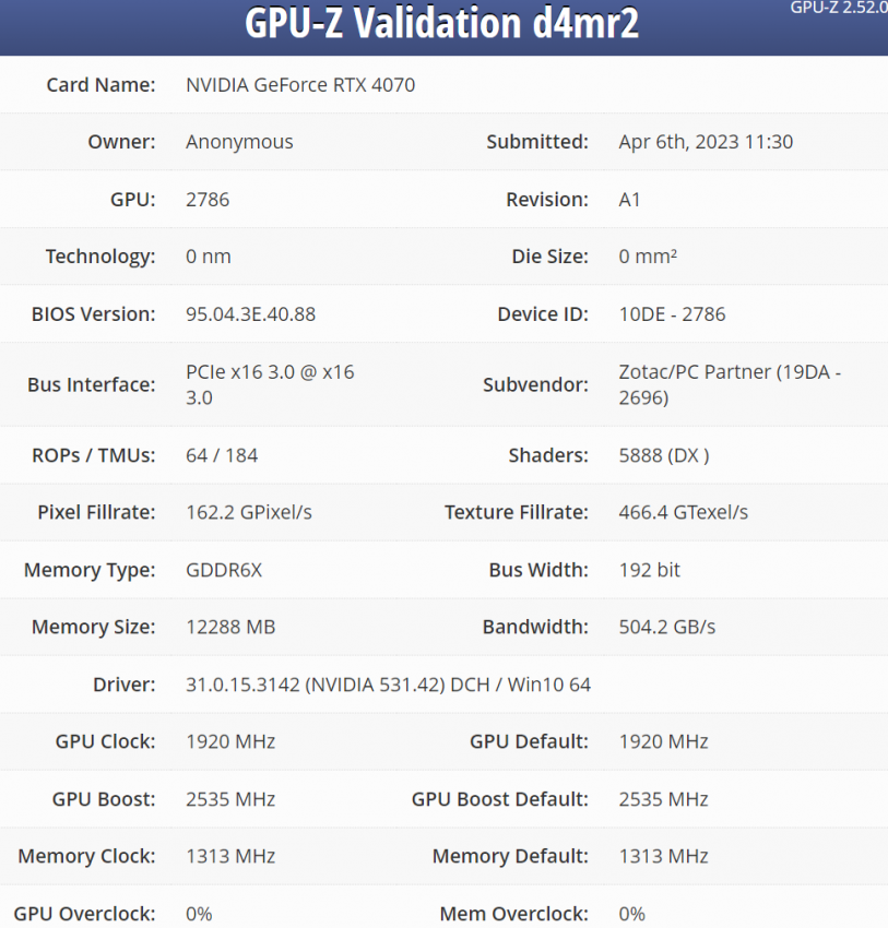 Видеокарта GeForce RTX 4070 прошла процесс валидации утилитой GPU-Z. Хотя характеристики ускорителя известны уже давно из утечек, теперь появились доказательства тестирования одной из нереференсных версий будущего ускорителя.