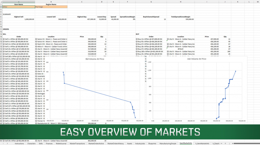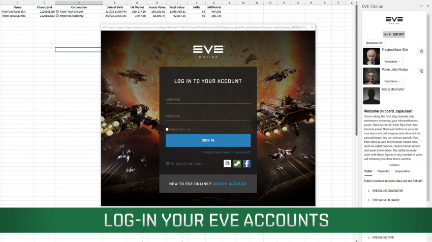 Надстройка позволит выводить данные персонажей и учётных записей EVE Online в таблицу для изучения, получить доступ к информации об активах, их ценности и местонахождении, истории заказов, рыночной цене товаров и так далее.