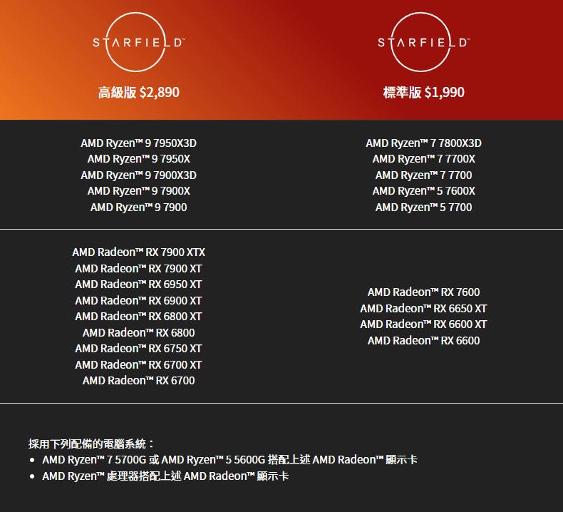 Комплекты предлагаются в версиях Standard Edition и Premium Edition — в последнем случае доступ к игре откроется за 5 дней до официального выхода. Комплекты Premium Edition адресованы покупателям процессоров AMD Ryzen 9 7000, а также видеокарт Radeon RX 7900 или мощнее Radeon RX 6700. Standard Edition достанется покупателям процессоров AMD Ryzen 7 и Ryzen 5 7000-й серии, а также видеокарт Radeon RX 6600 и RX 7500. Для получения подарка тайваньским покупателям предлагается заполнить форму на сайте, указав модель и серийный номер акционного устройства, а также приложив скан чека и фото упаковки.