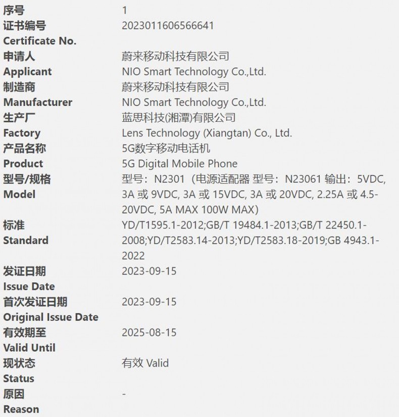 15 сентября смартфон Nio прошёл сертификацию у China Compulsory Certification (CCC), что раскрыло дополнительные подробности о грядущем смартфоне. В частности, сборку смартфона Nio будет выполнять компания Lens Technology из провинции Хунань. Эта компания поставляют Apple объективы и сопутствующие компоненты для iPhone, а также более двух лет сотрудничает с Tesla. Кроме того, в сертификате сообщается, что смартфон поддерживает быструю зарядку мощностью 100 Вт.
