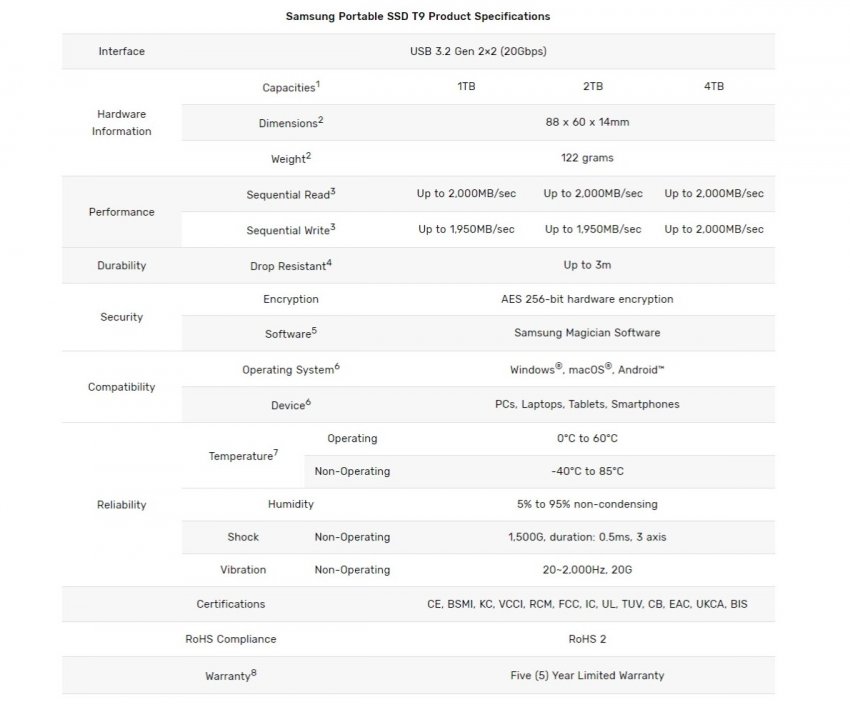 Размеры внешних SSD от Samsung составляют 88 × 60 × 14 мм, а их вес равен 122 г. Для них заявляется поддержка операционных систем Windows, macOS и Android.