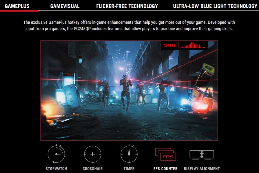 Монитор ROG Swift Pro PG248QP получил семь предустановленных игровых режимов, игровые функции ASUS GamePlus (перекрестие, секундомер, счетчик FPS и т.д.), а также оснащён технологиями Flicker-free для снижения эффекта мерцания и Low Blue Light для защиты глаз от вредного воздействия синего излучения.