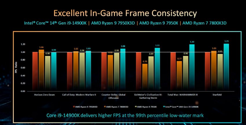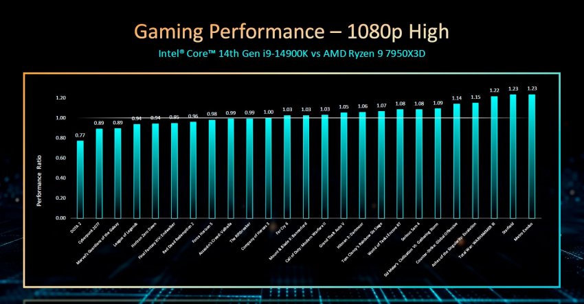 Intel не стала сравнивать Core i9-14900K с его предшественником, однако сравнила новый флагман с конкурентами в лице AMD Ryzen 9 7950X, Ryzen 9 7950X3D и Ryzen 7 7800X. Компания Intel признаёт, что в некоторых играх её новинка уступает Ryzen 9 7950X3D, однако в большинстве случаев всё же оказывается быстрее — вплоть до 23 %.