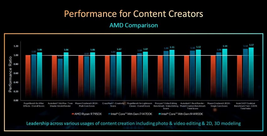 В профессиональных приложениях для работы с фото и видео, а также 2D- и 3D-проектирования Core i9-14900K и Core i7-14700K по сравнению с Ryzen 9 7950X могут обеспечить производительность соответственно на 17 и 14 % выше.