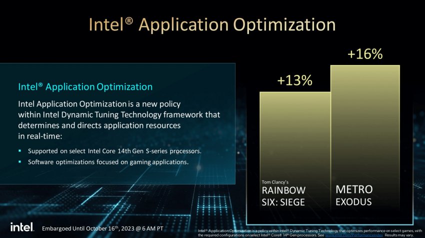 По умолчанию у новых чипов включена функция Intel Application Optimization (APO), которая автоматически идентифицирует программы и их потребности, и распределяет ресурсы CPU в режиме реального времени для оптимизации работы приложений. Правда, работает функция только с теми программами, для которых Intel создала профили в своем фреймворке Dynamic Tuning Technology (он работает вместе с Thread Director). В настоящее время APO поддерживает только две игры — Rainbow Six: Siege и Metro Exodus, в которых, как утверждает Intel, производительность за счёт APO увеличивается на 13 и 16 % соответственно. Intel отметила, что продолжит оценку игр и программ, которые получат преимущества от использования APO, и в будущем добавит новые профили.