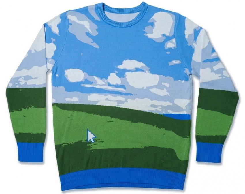 Компания Microsoft, согласно уже устоявшейся традиции, ежегодно выпускает так называемые «уродливые» рождественские свитеры, связанные с операционными системами Windows и их приложениями. В прошлом году компания выпустила свитер, посвящённый «Скрепышу» (виртуальному ассистенту Microsoft Office), а ещё ранее — свитеры в стиле игры «Сапёр», Windows 95 и других своих программных разработок. Темой «уродливого» рождественского свитера в 2023 году стали обои рабочего стола Windows XP.