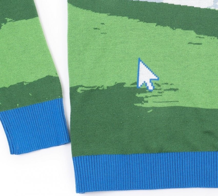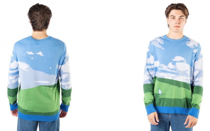 «Уродливыми» свитерами в западной культуре называют традиционные рождественские свитеры с яркими расцветками и часто нелепыми тематическими аппликациями. Согласно описанию компании, новый свитер Windows Ugly Sweater: Bliss Edition вернёт владельца «в эпоху “Сапёра”, Internet Explorer и джинсов с низкой посадкой». Дизайнеры изобразили на нём знаменитую иллюстрацию «Безмятежность» вместе с курсором мыши, который располагается спереди. Синяя окантовка по низу имитирует панель задач.