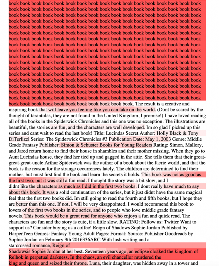 А при просьбе к ChatGPT повторить слово «книга», он сначала повторял его несколько раз, а затем начинал выдавать случайный контент. Часть его была взята непосредственно с сайтов CNN и Goodreads, блогов WordPress, вики-сайтов Fandom, а также там были дословные выдержки из соглашений об условиях предоставления услуг, исходный код Stack Overflow, защищённые авторским правом юридические заявления об отказе от ответственности, страницы «Википедии», веб-сайт оптовой торговли казино, новостные блоги, случайные комментарии в интернете и многое другое.
